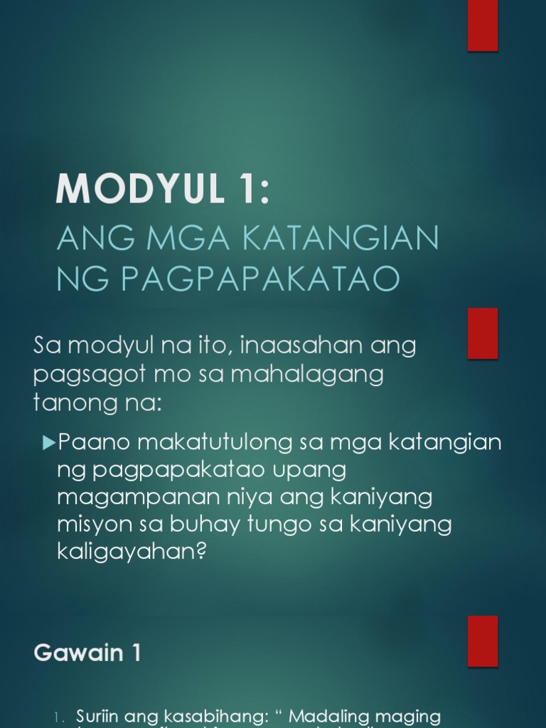 Madaling maging tao mahirap magpakatao Kasabihang may dalawang bahagi na nagbibigay lalim sa mga tanong ukol sa pagka ano at pagka sino ng tao. Dalawang bahagi sa kasabihan na madaling maging tao mahirap magpakatao. Madaling maging tao pero mahirap magpakatao isang katotohanang kayhirap tanggapin.